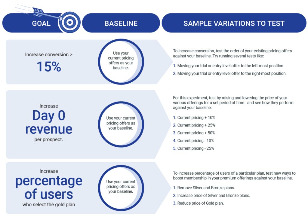 A great place to start is by experimenting with different pricing offers to prospects. Here are a few example starter goals and their corresponding experiments: